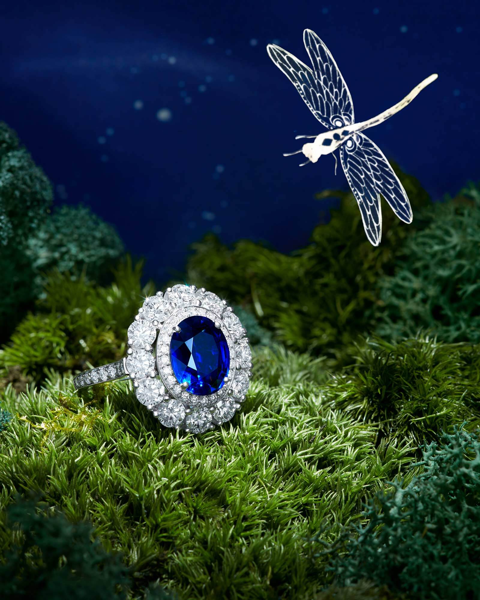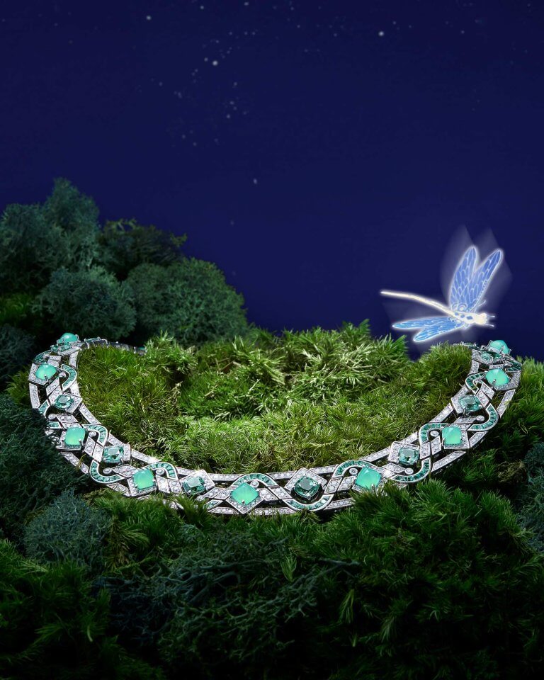 The Couture Serpentine necklace weaves its magic, sprinkling precious green gemstones across the mossy forest floor, watched over by a graceful dragonfly.