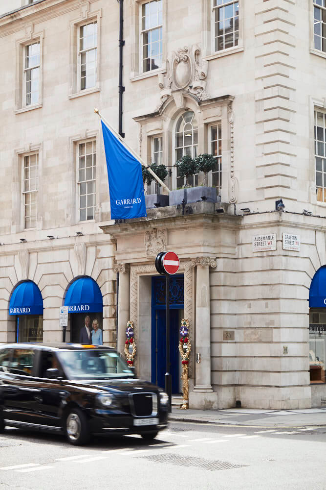 If you are planning on visiting our Albemarle Street flagship in the days leading up to the coronation, you are in for a surprise. You can’t miss our showroom door, which has been transformed from steel grey to Royal Blue – the colour of Garrard when Queen Victoria first appointed us Crown Jeweller in 1843. In the window, an official portrait of King Charles and Queen Camilla wishes Their Majesties the warmest congratulations on their coronation.
