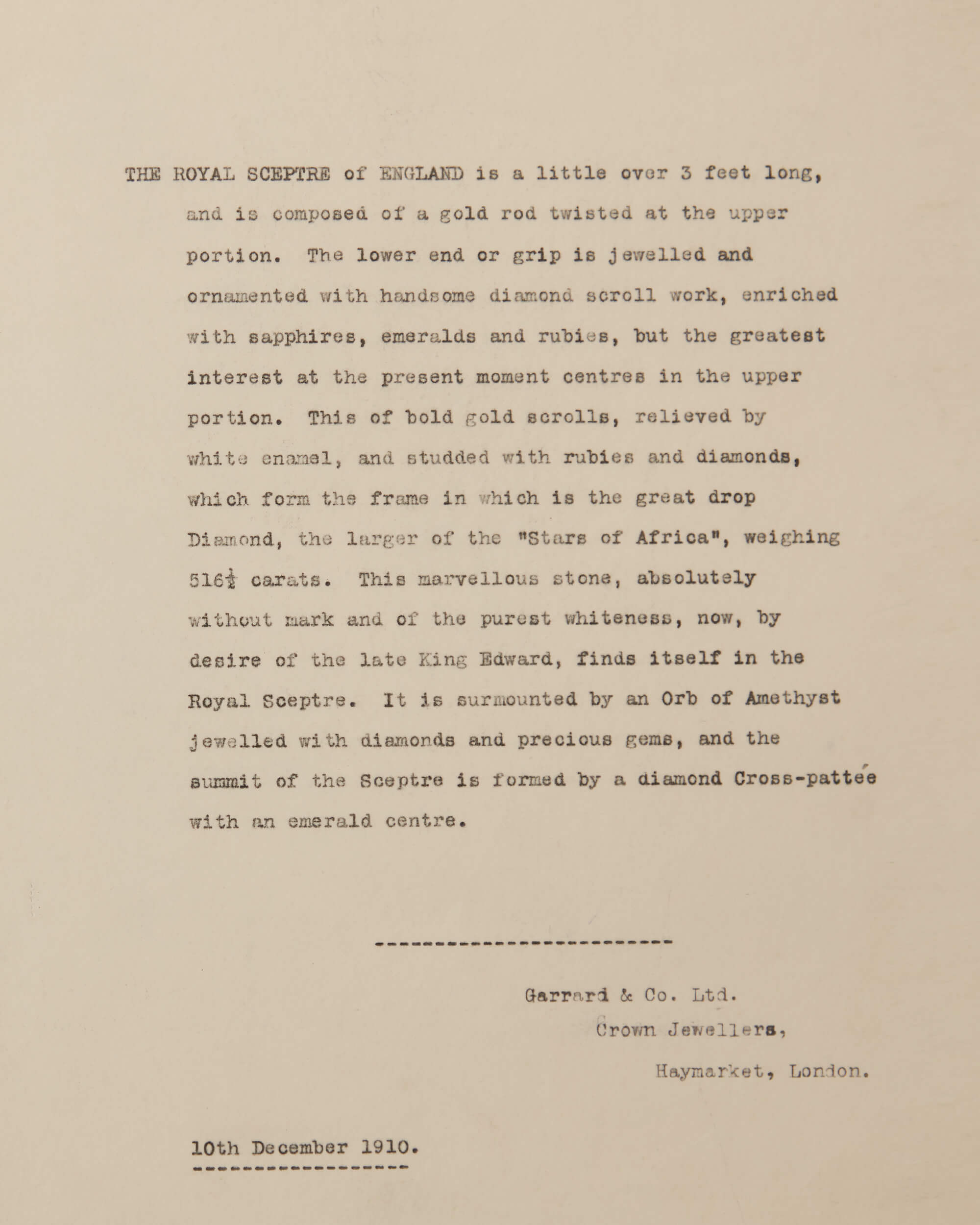In a separate memorandum, also dating from 1910, Crown Jeweller Garrard outlines what it has achieved with the setting of the Cullinan I and II diamonds, collectively known as The Stars of Africa. “Not only may the stones be worn with the Crown and Sceptre, but they may also form part of the Queen’s Jewels at State ceremonies,” it states. “When this lesser Star of Africa is in its place, King George’s Crown [the Imperial State Crown] will contain examples of all the methods of diamond cutting from the days of Charles II.”