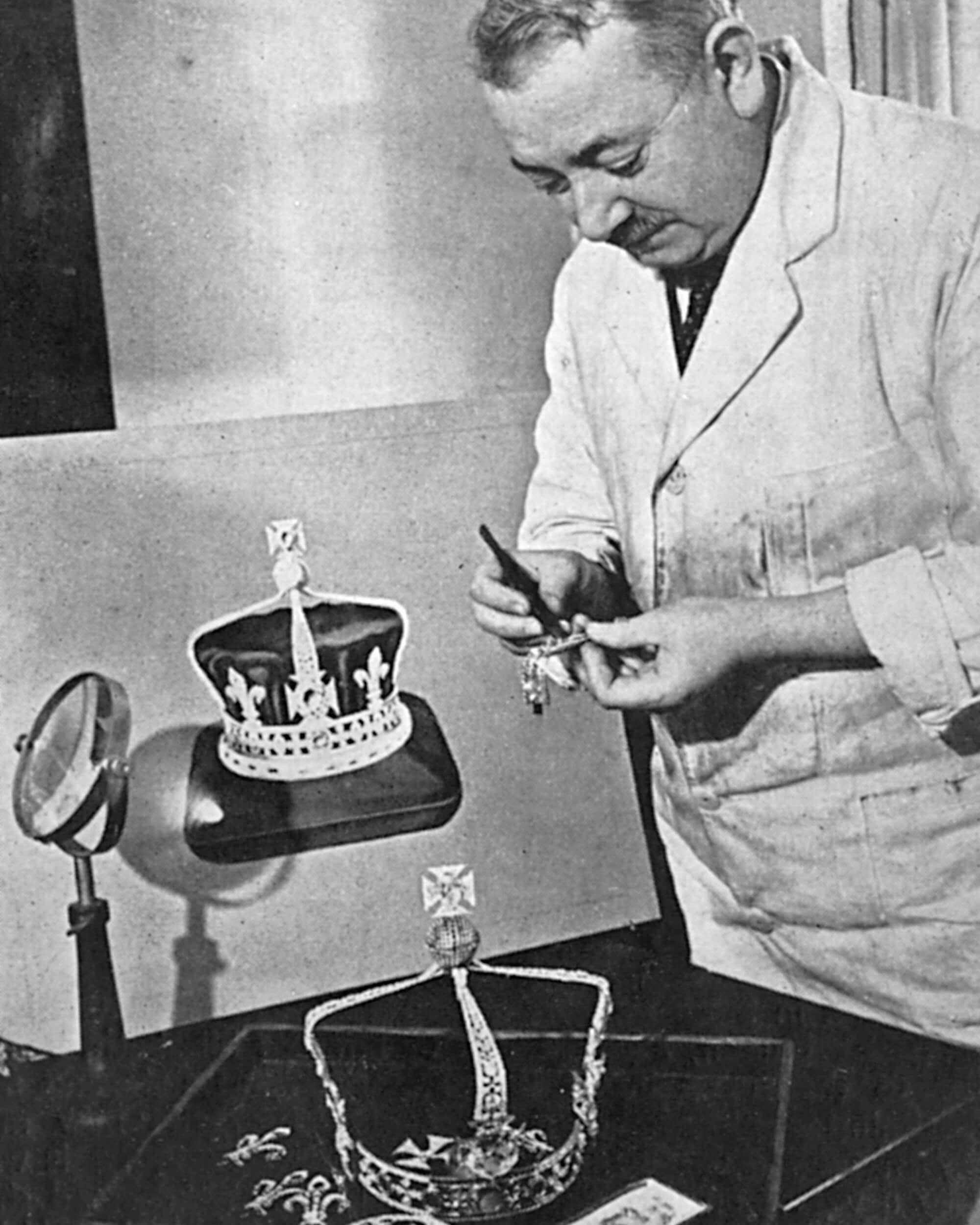 Up to this point, the 104 carat Stuart Sapphire had been set in the front of the Imperial State Crown. To accommodate the much larger 317 carat Cullinan II diamond, the crown had to be dismantled, revealing its clever construction, with the different stones set in removable mounts, making it easy to take them out when the crown was not in use. When Garrard’s artisans had finished adjusting the band of the crown to replace the Stuart Sapphire – which was moved to the back of the crown – slowly and carefully it was pieced back together again, now adorned with the Cullinan II.