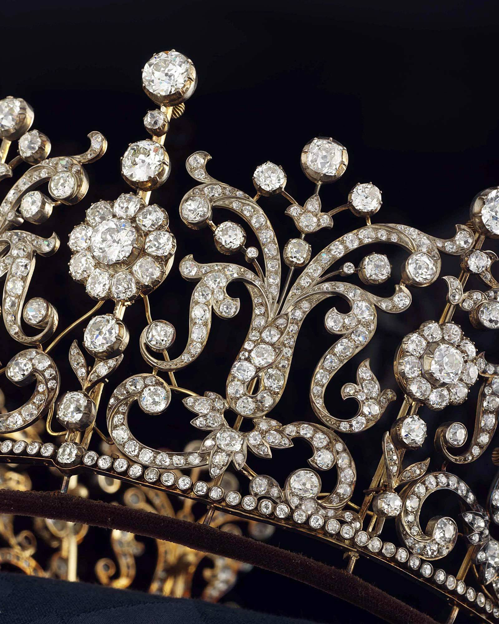 Set with cushion shape and old-cut diamond clusters, alternating with diamond-set scroll motifs, the elegant design evokes the floral motifs favoured by jewellers during the Victorian era. It also cleverly disguises the fact that the Poltimore Tiara is convertible, transforming into a fringe necklace and 11 separate brooches.