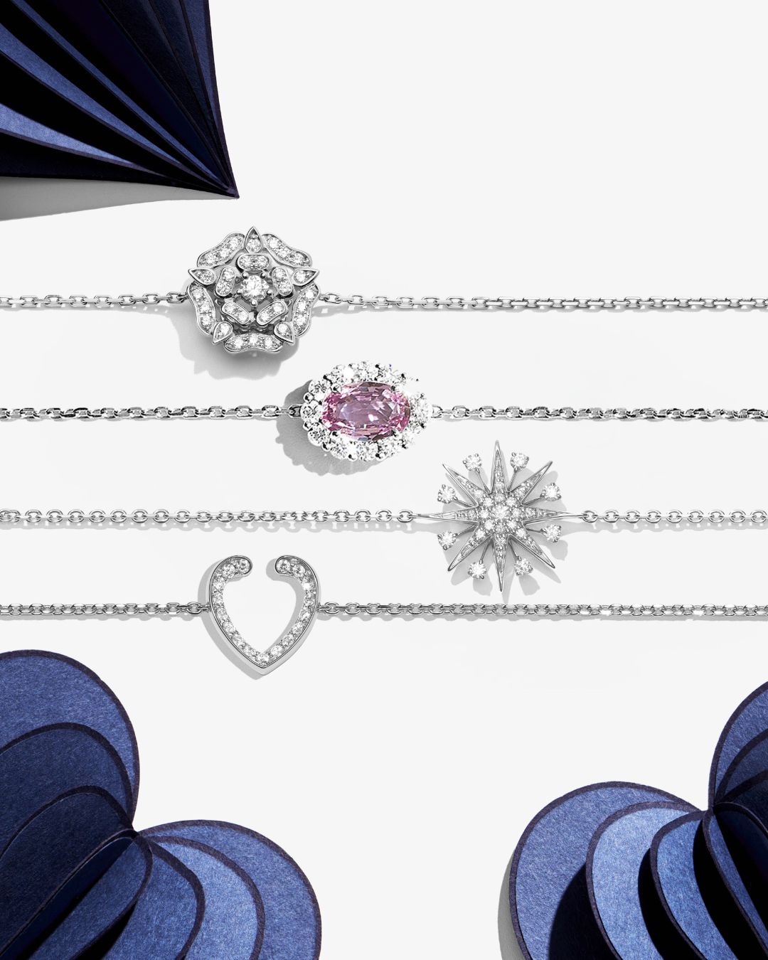 White diamonds and coloured gemstones form luminous feathered wings across a collection designed to be worn together.
