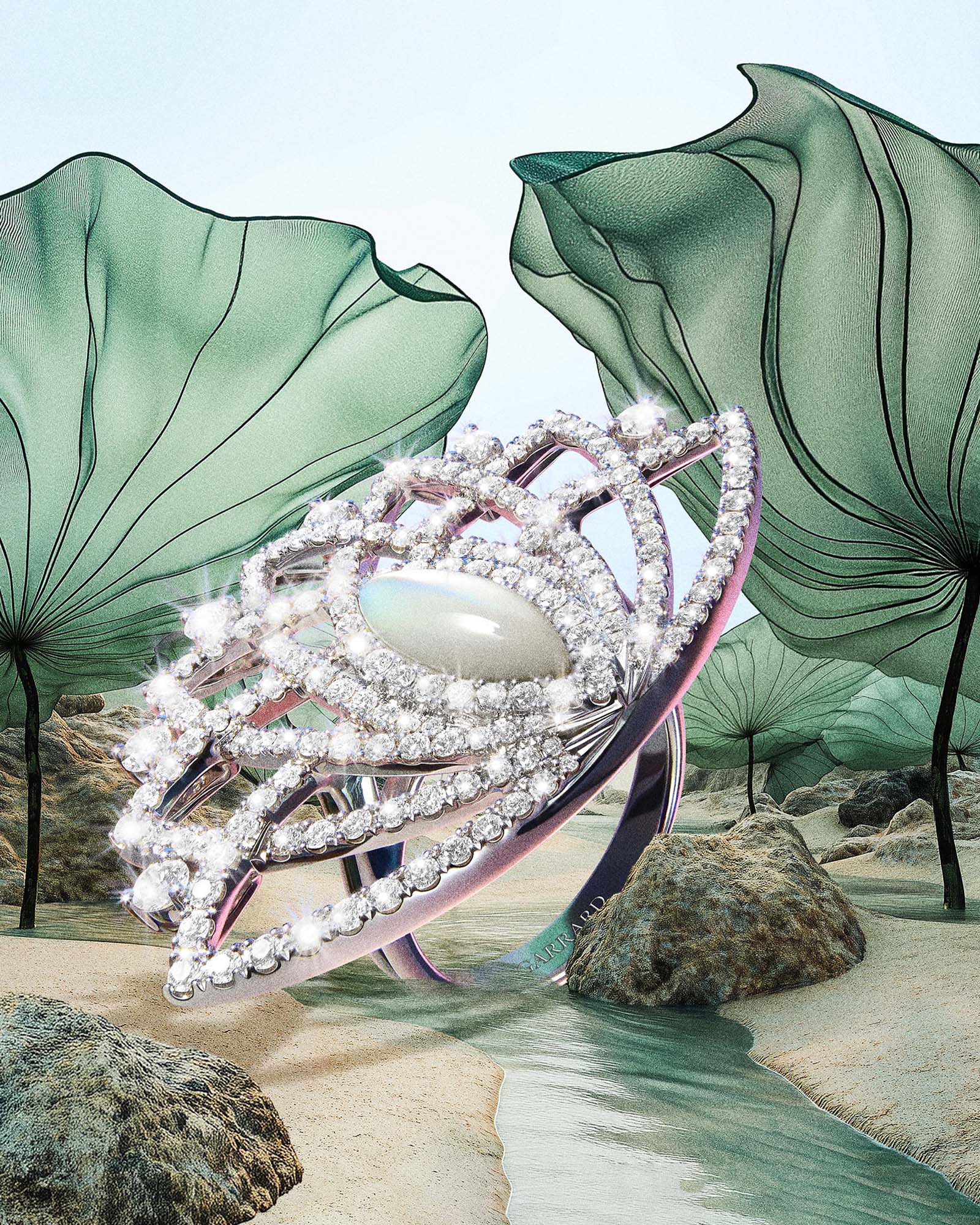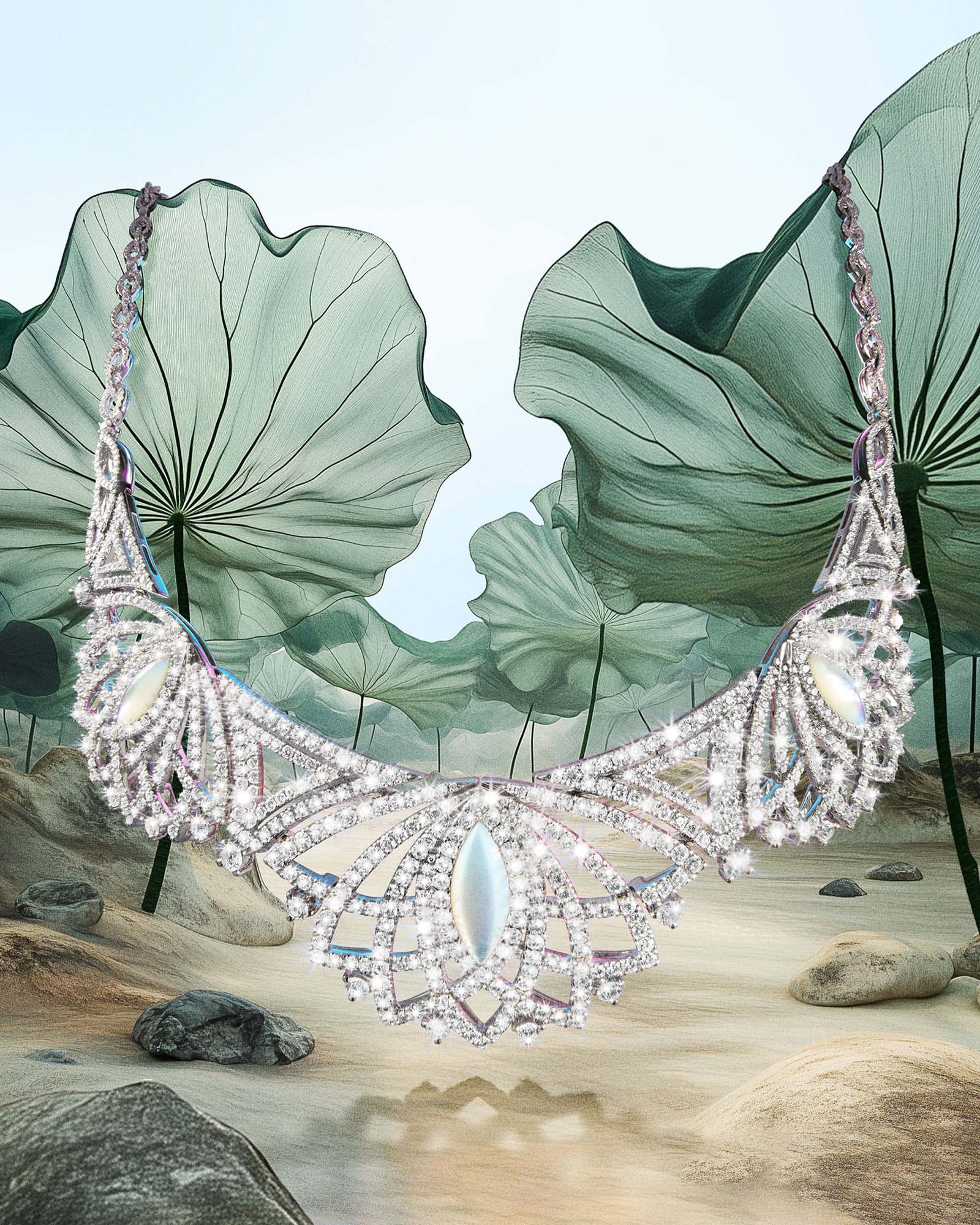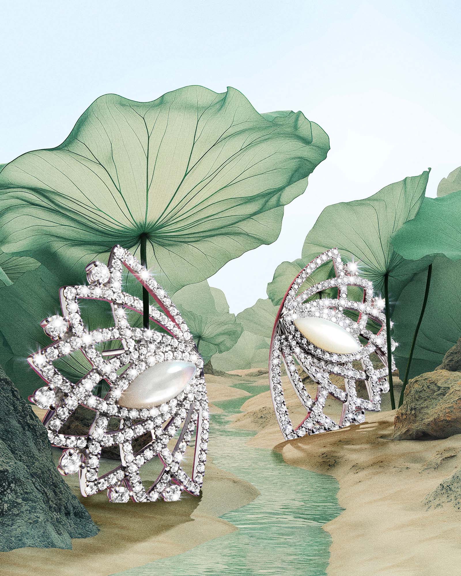 Pairing diamonds with shimmering mother-of-pearl cabochons, a High Jewellery suite echoes the flower’s natural glow in sunlight.