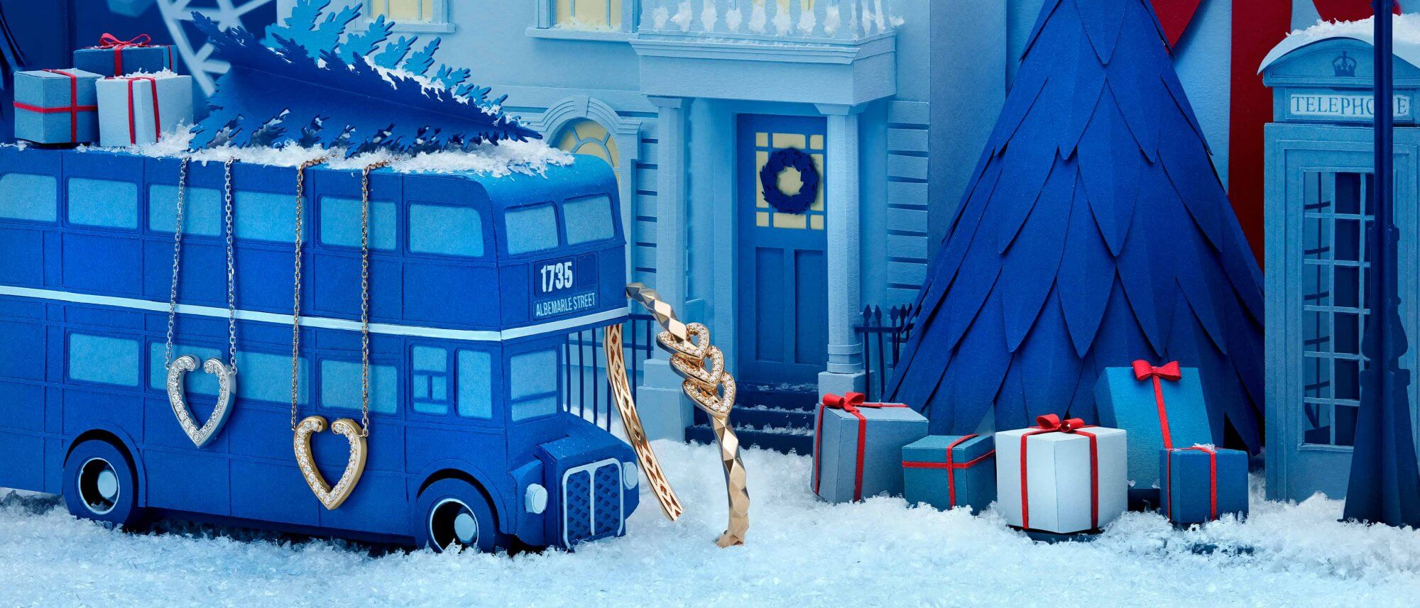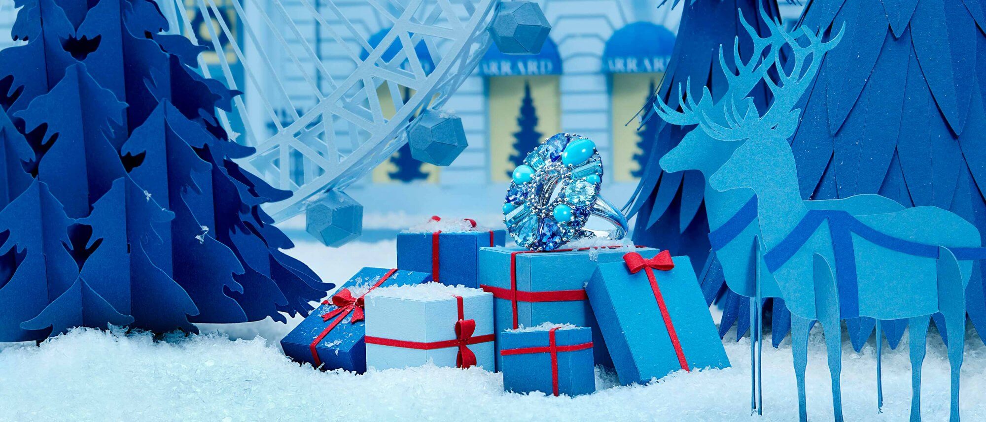 Combining the icy beauty of diamonds with vibrant coloured gemstone centre stones, 1735 Double Cluster rings shimmer in the snow.
