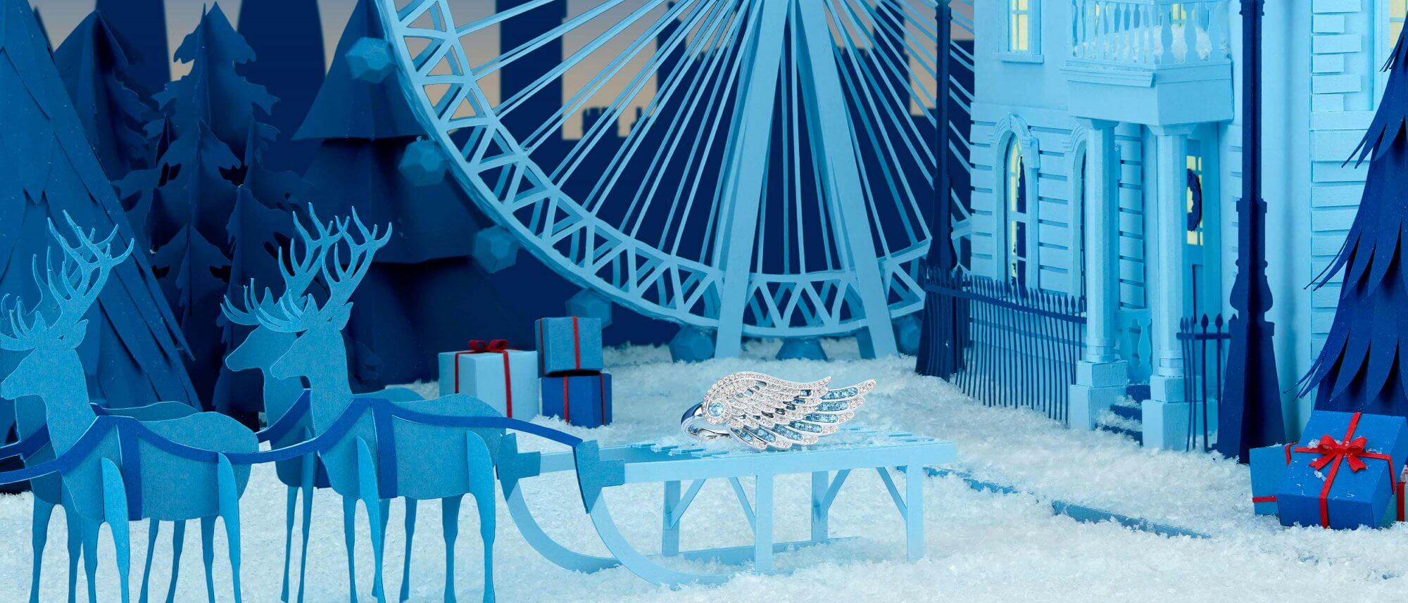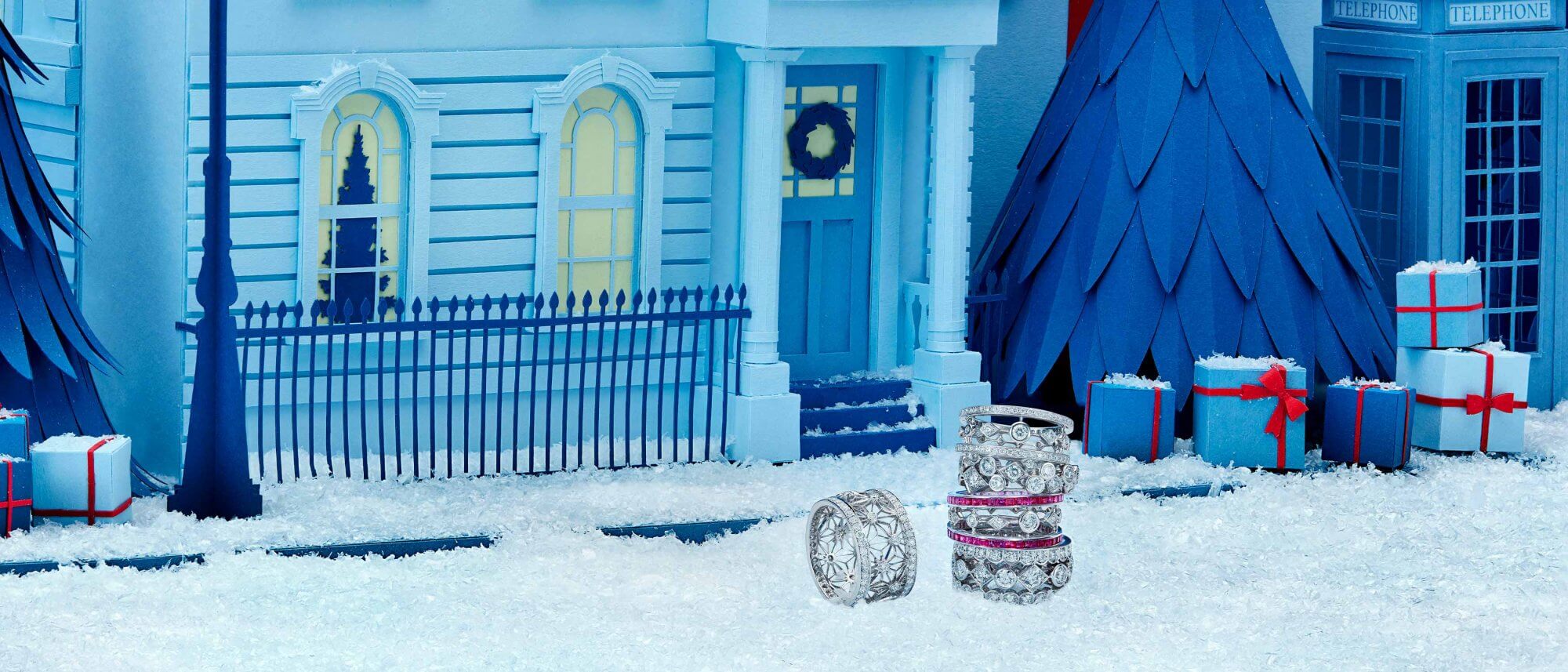 A snow-kissed doorstep delivery: rings that shine with diamonds and coloured gemstones, designed to be worn solo or across the fingers.